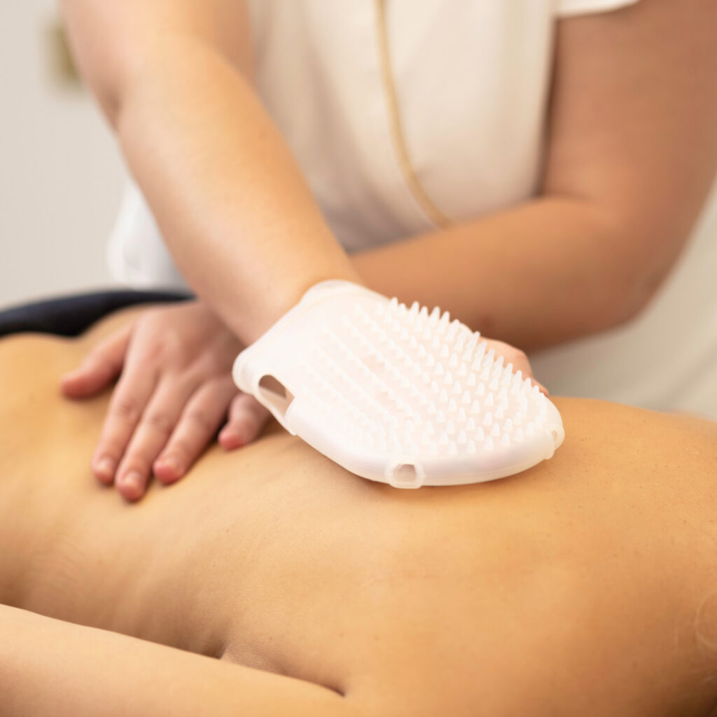 Atliekamas lengvas atpalaiduojantis masažas pečių, kaklo ir viršutinės nugaros dalies srityje, skatinantis kraujotaką ir paruošiantis odą tolimesnėms procedūros priemonėms.